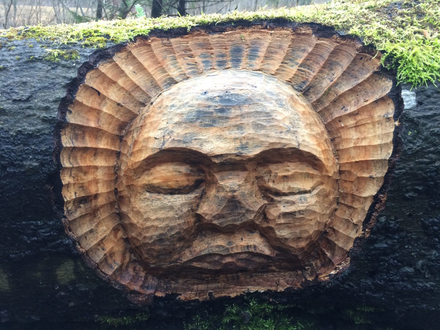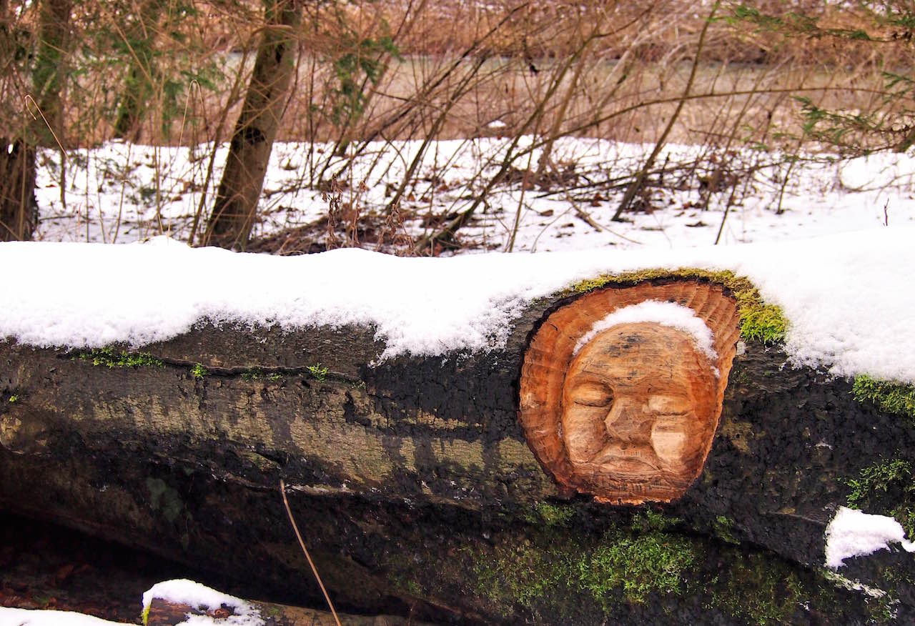 Seitdem ich das Gesicht entdeckt habe, besuche ich es immer wieder, um zu sehen wie es sich verändert. Die Farbe des Holzes wird witterungsbedingt von Mal zu Mal dunkler. Als es ein Wochenende geschneit hatte, war das Baumgesicht fast nicht mehr zu sehen. Nachdem ich den Schnee vom Baumstamm weg gewischt hatte, kuckte das Baumgesicht fast so, als ob es die Backen aufblasen würde, weil es ihm zu kalt geworden war.