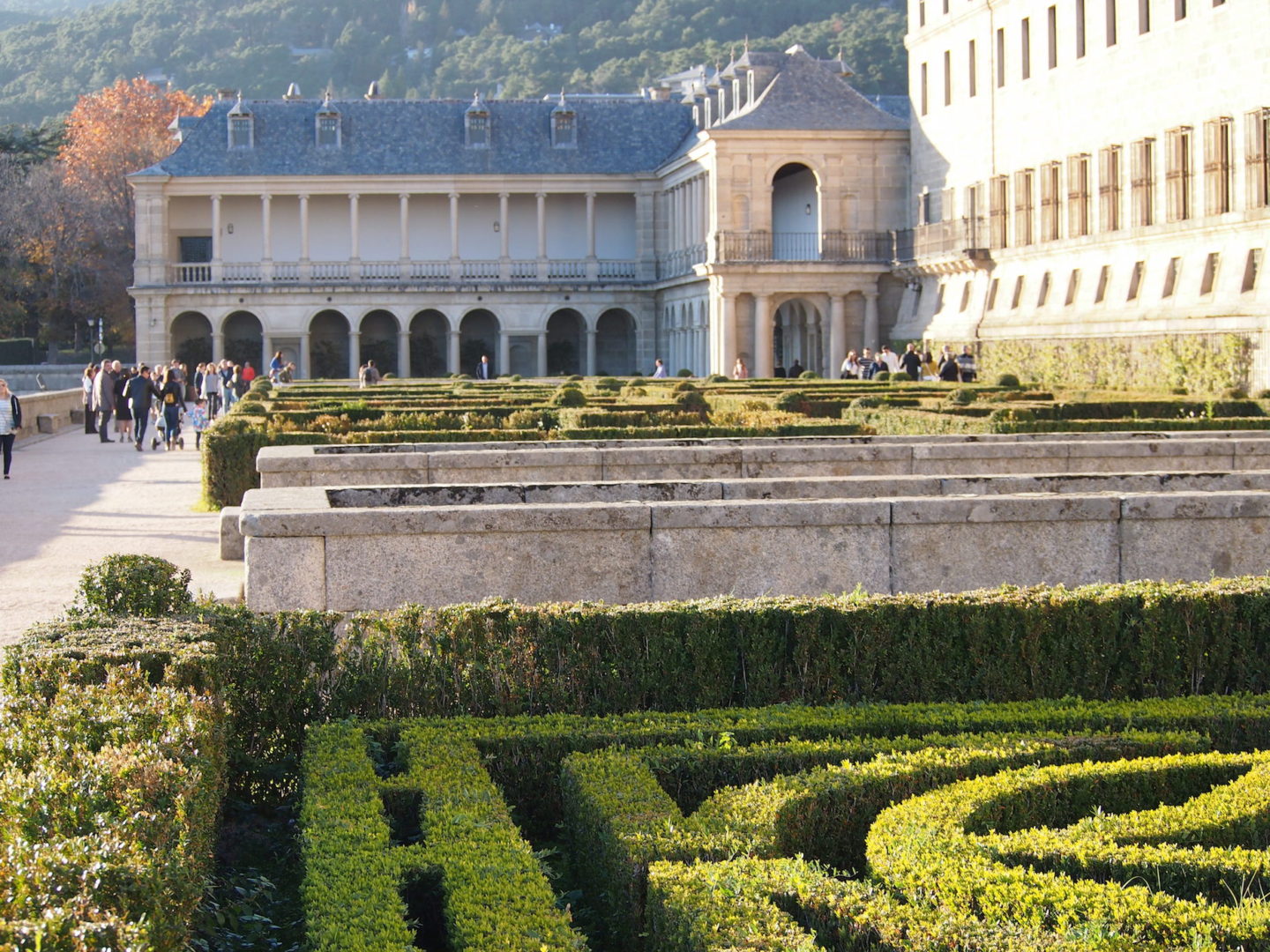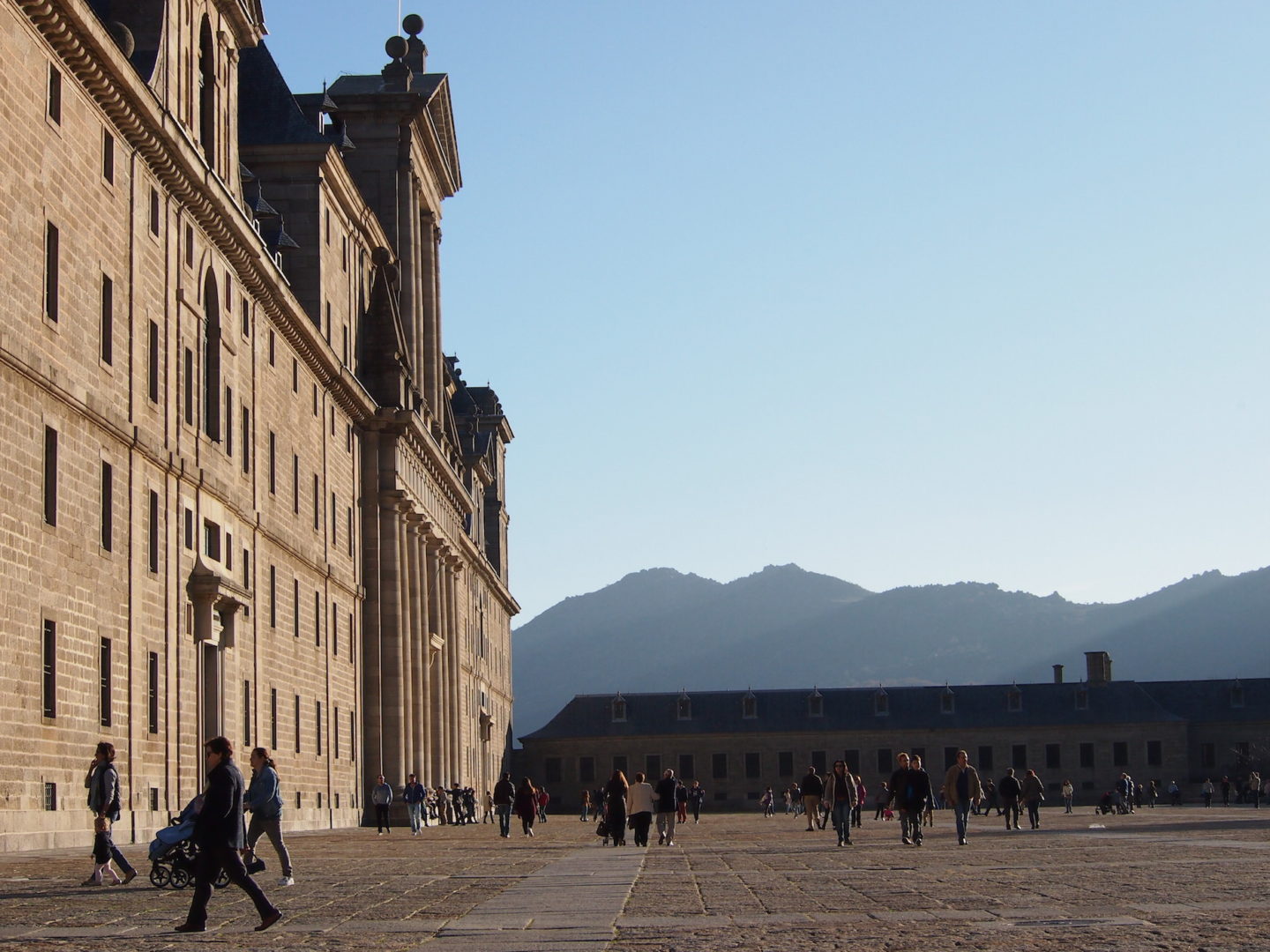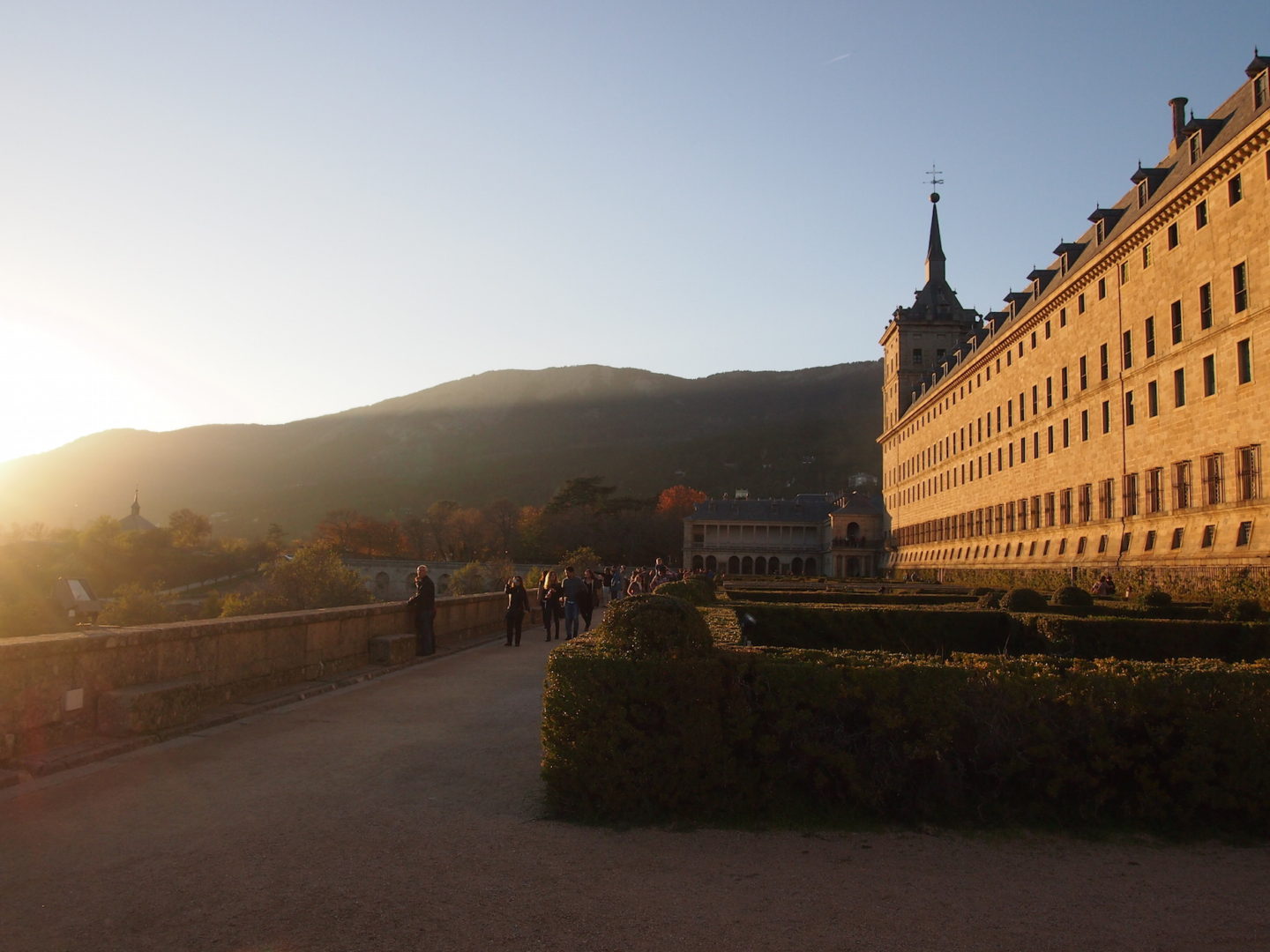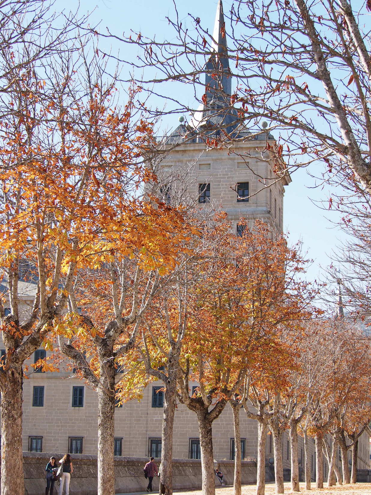 Vom Busbahnhof des Städtchens San Lorenzo de El Escorial ist es nur ein kurzer Fußweg zu meinen Ziel. Ganz lange will ich diesen besonderen Ort schon besuchen. Einmal hatte ich es versucht und bin an einem Montag dort gelandet. Leider geschlossen. Heute hätte der Tag nicht perfekter dafür sein können. Die Baumallee empfängt mich und führt mich direkt zum Escorial. Wie ein Kunstwerk ist die Farbenpracht der Bäume. Der trockene Wind streicht mir angenehm um die Beine und die Sonne weist den Weg. Nur wenige Besucher sind im November hier und so genieße ich den Spaziergang und das „hier sein“.