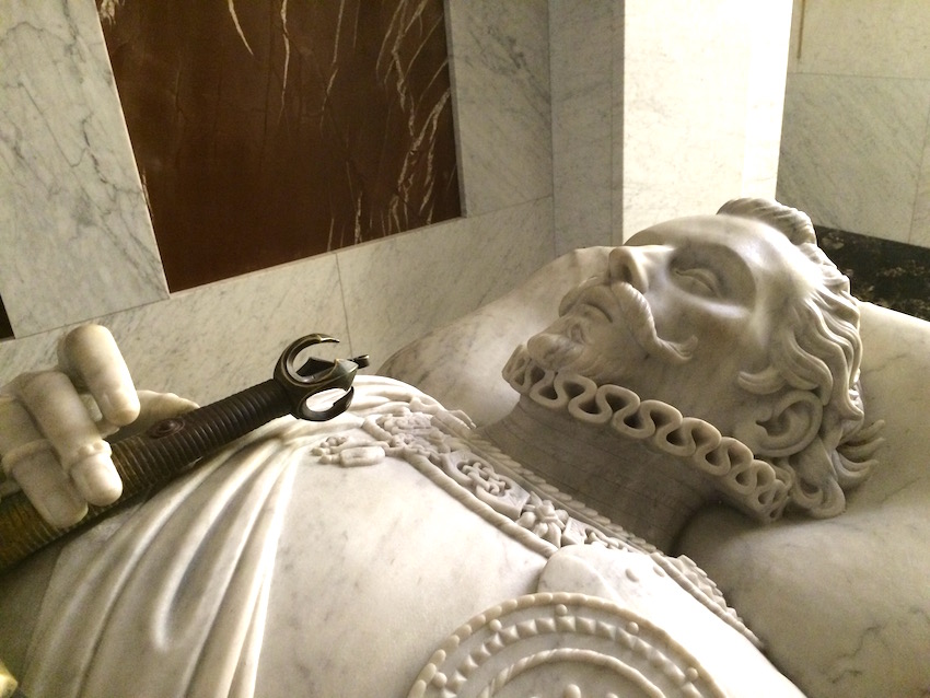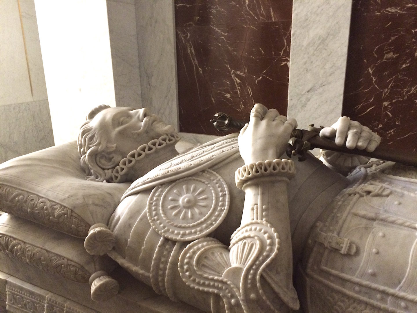 Durch das Schild an dem Sarkophag finde ich den Mann mit königlichem Geblüt im Netz. Es ist Juan de Austria geboren am 24. Februar 1547 in Regensburg, gestorben am 1. Oktober 1578 in Bouge im heutigen Belgien. Er war Sohn Kaiser Karls V. und der bürgerlichen Regensburger Gürtlerstochter Barbara Blomberg.