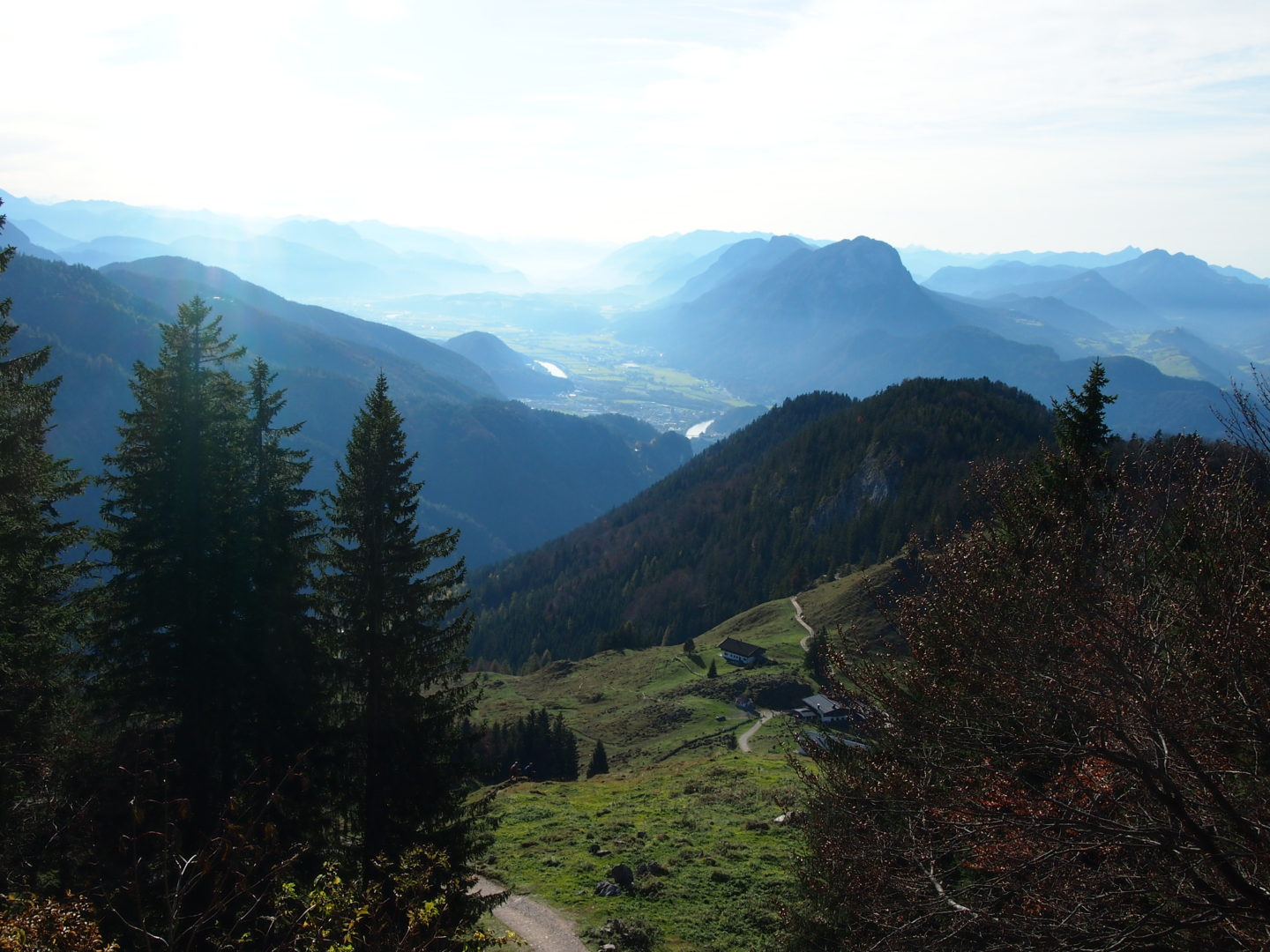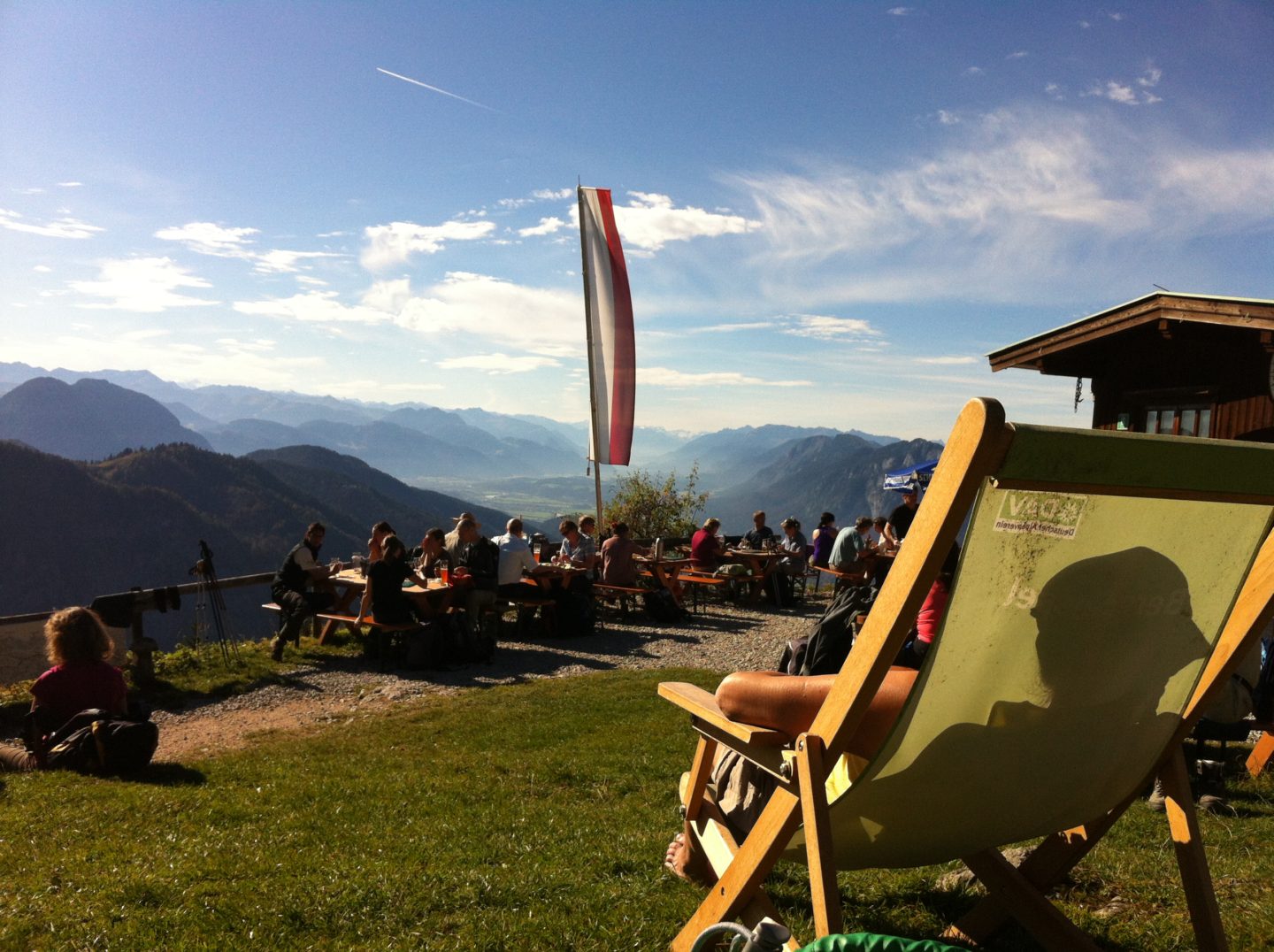 Offensichtlich bevorzugte er wie ich eine der etwas zurück gesetzten Bänke, denn er nahm mit seinem Kaffe und dem Apfelstrudel an einem benachbarten Tisch Platz. Noch nie habe ich bei einem unbekannten Menschen so freundliche Augen und ein warm strahlendes Herz gespürt. Ein Gefühl das nahezu greifbar war. Über den Apfelstrudel kamen wir ein bisschen ins Gespräch. Wir waren beide alleine aus München gestartet, weil keiner unserer Freunde Zeit für die Berge hatte. Er genoss seinen Kaffee und strahlte eine unglaublich angenehme Ruhe aus. Immer wieder breitete er seine Karte aus, um den weiteren Weg zu suchen. Verwundert und belustigt betrachtete ich ihn, als er seinen Rucksack auf den Kopf stellte und ihn immer wieder ein- und auszuräumen schien. Während er an dem Tag noch einen Gipfel erobern wollte, zog es mich hinab zu Kaffee und Kuchen bei Freunden in Kiefersfelden.