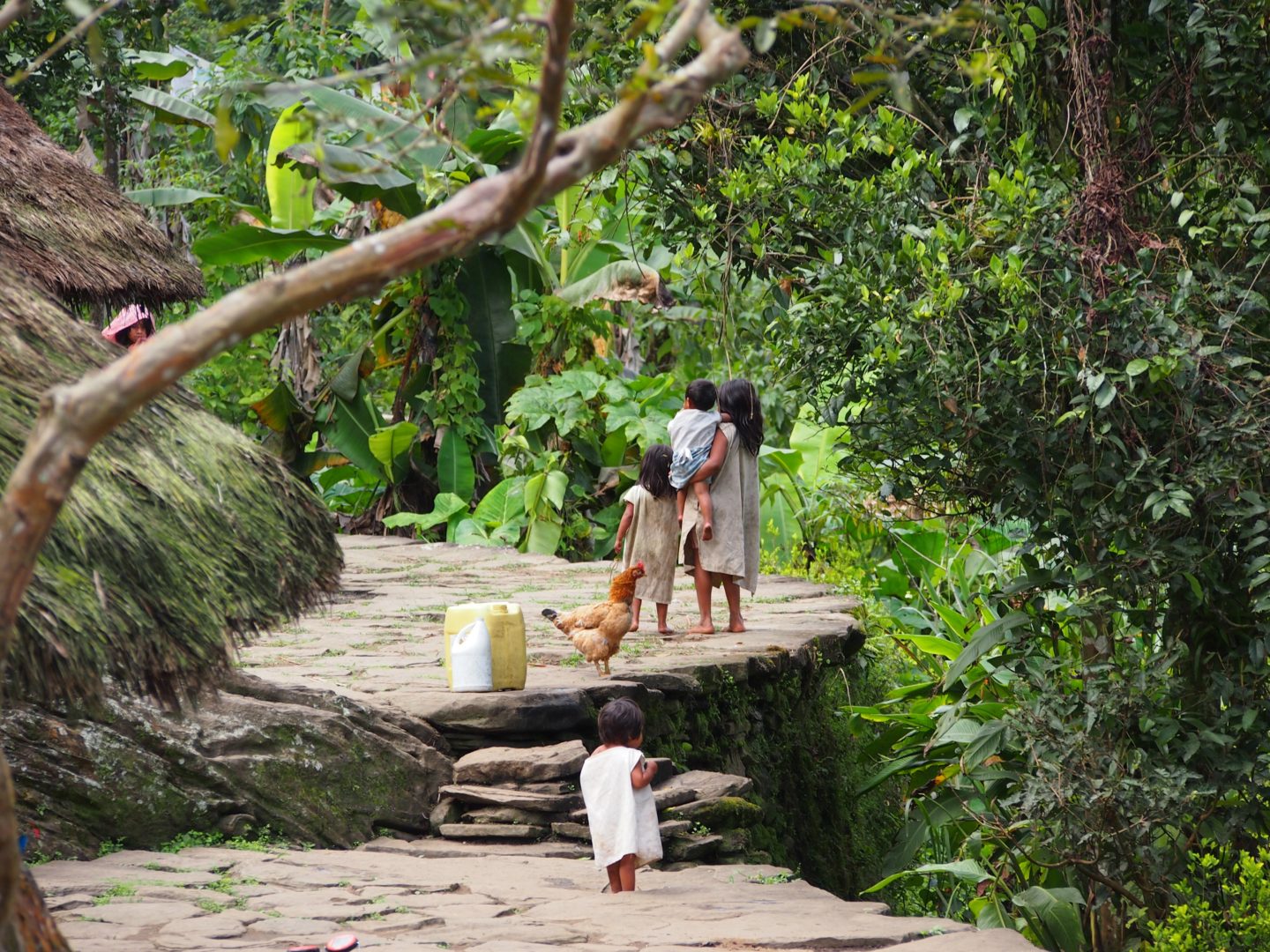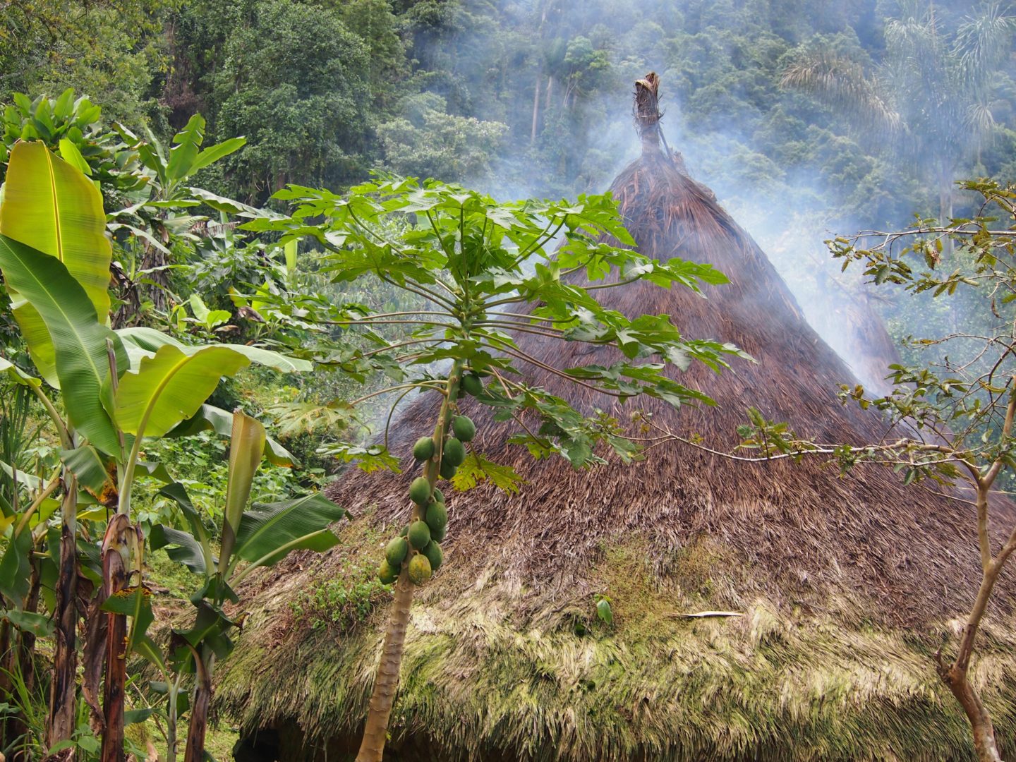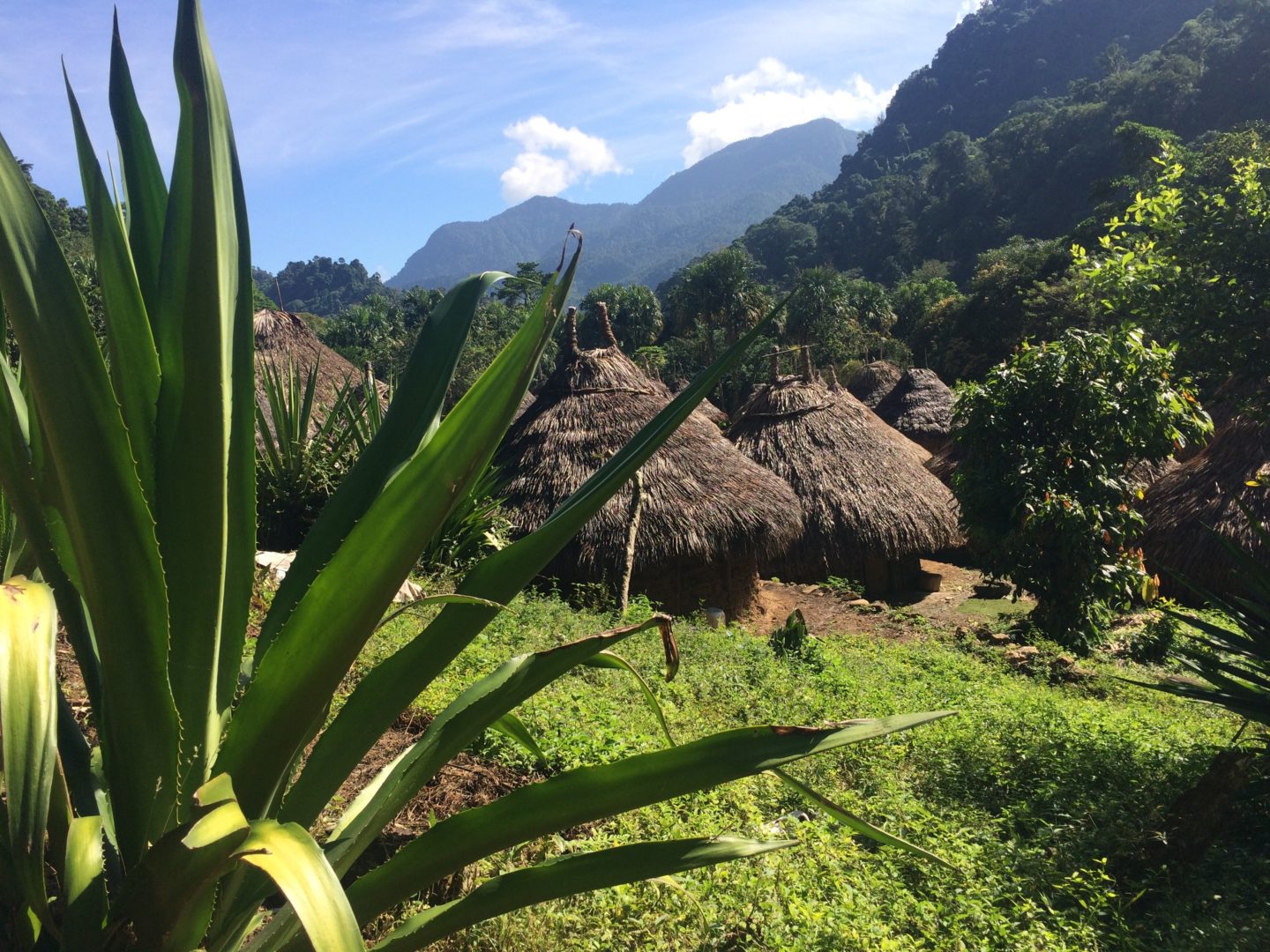 Wir passieren ein zauberhaft gelegenes Dorf, in dem wir uns vorstellen können, wie die Tayrona früher in der verlorenen Stadt gewohnt haben und auch heute noch leben. Die Rundhäuser aus einem Holz-Gerüst sind mit Lehm ausgefüllt und mit Palmenblättern gedeckt. Meist steht ein Baumstamm in der Mitte, wird uns erzählt. Dieser dient als Feuerstelle und nachts als Wärmespender. Der Rauch des Feuers zieht durch das Palmendach ab. Schlau gemacht, denn damit wird verhindert, dass sich Ungeziefer im Dach festsetzt. Ein Ehepaar lebt nicht unter demselben Dach zusammen. Es gab Häuser für Frauen und Kinder sowie für Männer. Zu jeder Siedlung gehörten Felder mit unterschiedlichen Nutzpflanzen und Tieren – wie Hühner oder Schweine.