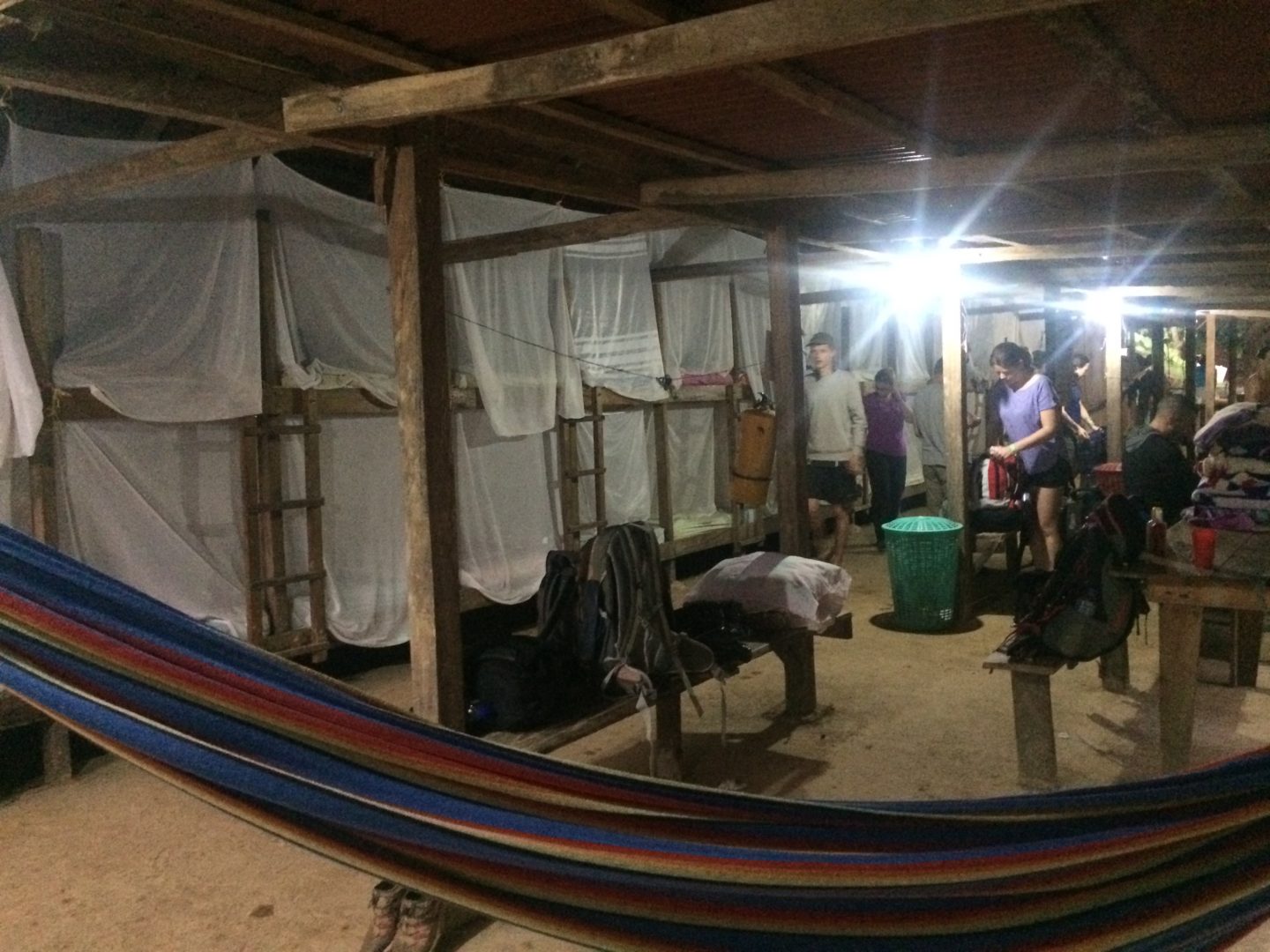 Nach 7,6 Kilometern erreichen wir das erste Camp. Es ist überschaubar und angenehm ruhig. Stockbetten sind nebeneinander gereiht und jeder sucht sich einen Platz unter dem Moskito Netz. Jeden Abend werden wir bekocht. Diesmal an einem langen Holztisch auf festen Boden, an dem die ganze Gruppe Platz findet. Die Sonne ist schon um 6 Uhr unter gegangen. Müde und erschöpft fallen manche früher, andere etwas später ins Bett. Aber um zehn Uhr sind alle unter ihren Moskito-Netzen verschwunden. Denn am nächsten Tag heißt es um 5 Uhr aufstehen.